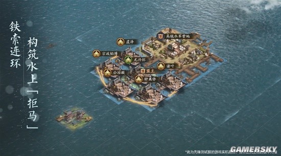 铁索连环,构筑水上「拒马」,连舫效果提升耐久和强化战斗,可抵挡入侵敌军。
