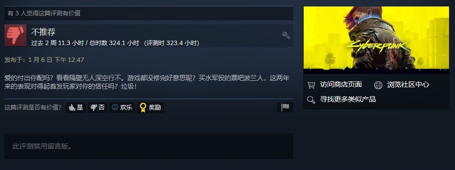 《赛博朋克2077》近日在Steam的年度奖项中获得了爱的付出奖项,而这一结果引发了部分玩家的不满,这部分玩家认为游戏在今年什么也没做,能够获得奖项全靠扳机社的动画“边缘行者”,为此游戏在短时间内收到了大量的差评。