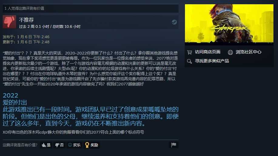 在最近《赛博朋克2077》Steam收到的评测中,大批玩家吐槽《赛博朋克2077》至今仍没有实现当初承诺的内容,并且2022年也没有更新什么实质性内容,却获得了Steam爱的付出奖,这全是依靠扳机社的动画“边缘行者”大火,带动了游戏迎来第二春。