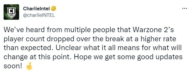 Twitter账号CharlieINTEL是知名的《使命召唤》新闻情报媒体,近日,该账号发文称《使命召唤:战区2》的玩家下降幅度远超预期,文中说道:“我们从很多人那里听说,战区2的玩家数量在休整期间下降的速度比预期的要快,目前还不清楚这一切意味着什么,希望我们能尽快得到一些好的内容更新!”