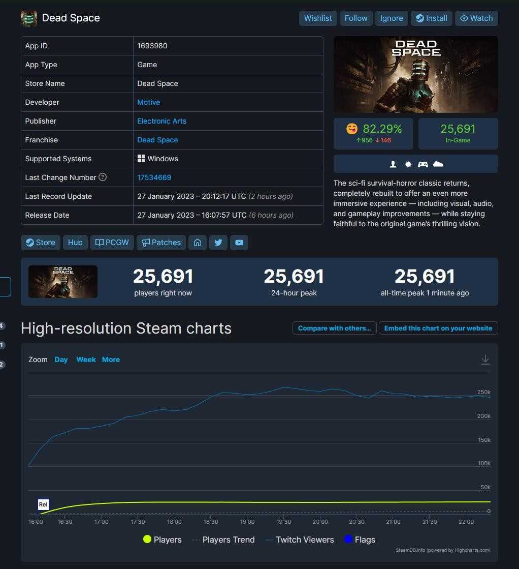 根据SteamDB的数据,《死亡空间:重制版》在Steam上的同时游戏玩家数量在发行后的几个小时内达到了25691人的峰值。这远远超过了之前任何一个《死亡空间》版本所提供的数字——当然在之前《死亡空间》游戏发行时,Steam还是一个规模小得多的平台,并且没有像现在这样占据那么多的PC用户基础。