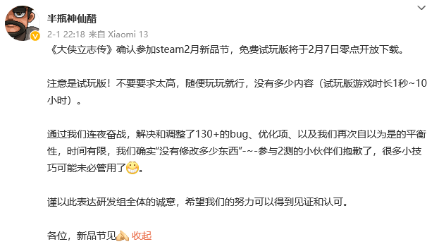 《大侠立志传》作为一款开放世界的武侠新作,该作的游戏制作人“半瓶神仙醋”宣布游戏将会在2月7日零点开放免费下载,同时制作人也提醒玩家由于是试玩版所以游戏的内容和完整性都不会太多,感兴趣的玩家可以关注一下。