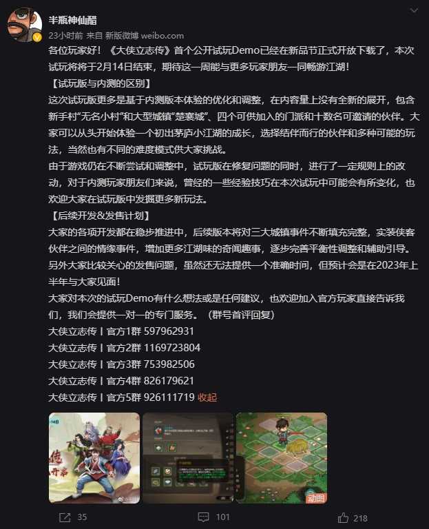 《大侠立志传》目前已经上线了游戏的首个试玩demo,游戏的作者也就游戏目前的状况以及未来会做出的发售计划进行了表示,本次试玩版虽然内容有限,但是距离游戏的正式推出也不远了,具体的消息一起来看看吧!
