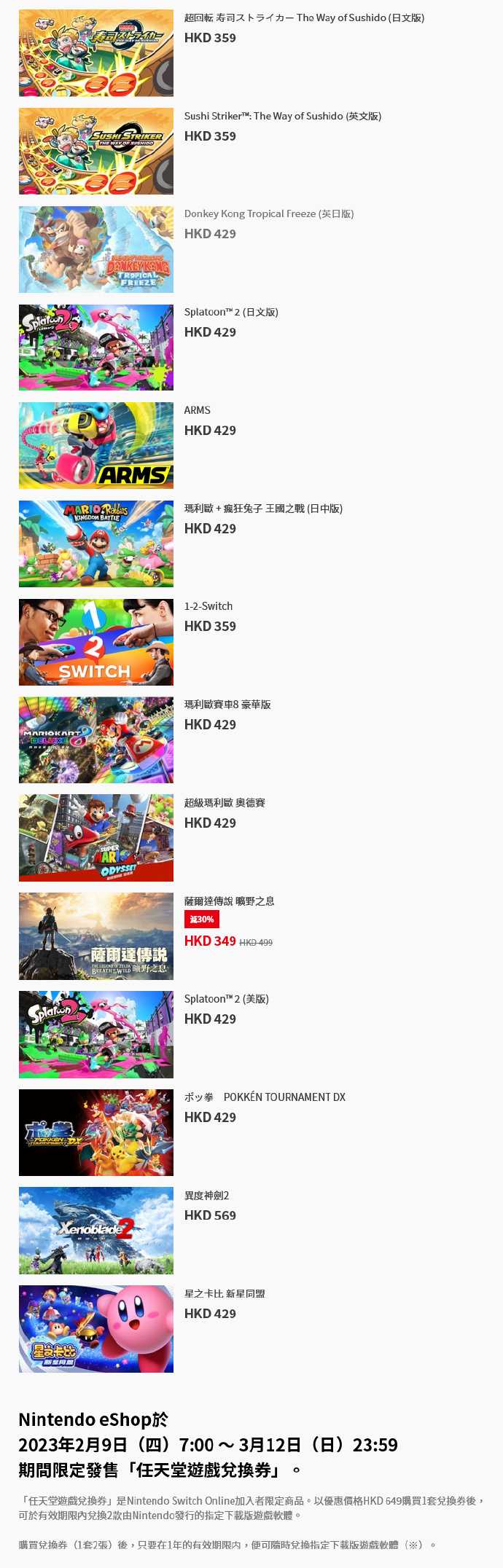 任天堂香港今日宣布Nintendo eShop将会在2月9日(四)7:00 ~ 3月12日(日)23:59期间发售「任天堂游戏兑换券」,售价649港币,玩家可以任意兑换两款任天堂游戏,其中包含了任天堂直面会公布的《皮克敏4》、《塞尔达传说:王国之泪》等新作。