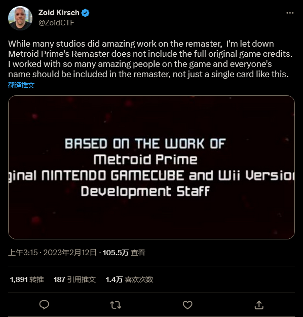于 2022 年在任天堂任职高级工程师的 Zoid Kirsch 在推特上分享称,《银河战士 Prime:重制版》并没有包括原版游戏的完整制作人员名单,而是写了这样一段话:“基于《银河战士Prime》(原始任天堂 Gamecube 和 Wii 版本)制作人员的作品(开发)。”