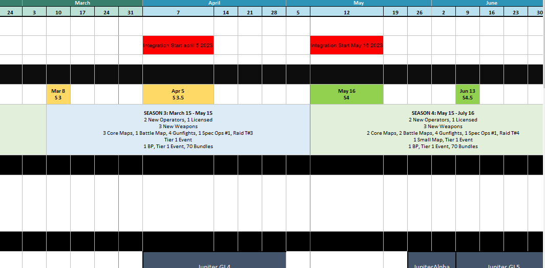 当然,从泄露图中还有“Jupiter”项目的日期,从图片中可以看出“JupiterGL4”(4月7日至28日)、“Jupiter Alpha”(5月26日至6月2日)、和“Jupiter GL5”(6月9日至30日)。据猜测这可能是《CODMW2》之后的新一代作品。值得一提的是,由于该漏洞发生在12月4日(动视对这个话题保持沉默),因此时间表中包含的信息可能已经改变。