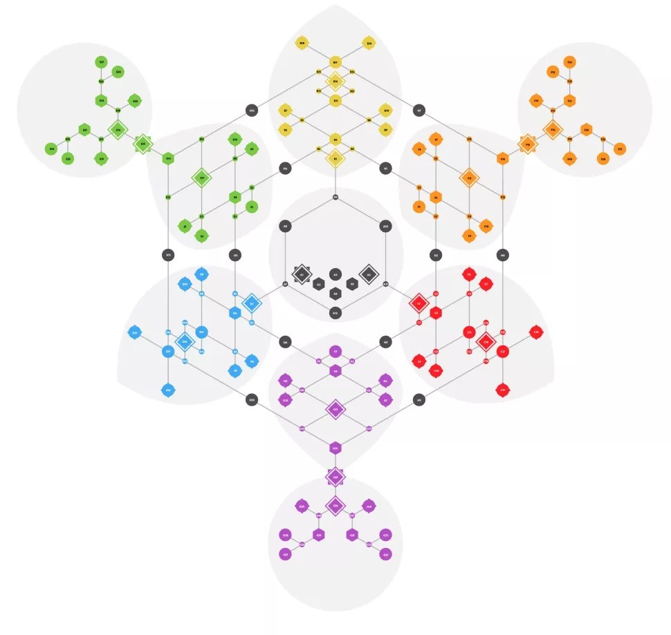 《龙腾世纪4》早期版本的技能树形似雪花状,在每个交叉点都有可购买的技能节点。该技能树显示了六种不同颜色的技能集合,似乎代表不同类型的职业。看来玩家可以自由跨越不同职业之间的界限,购买技能升级,有效地进行多职业构建。