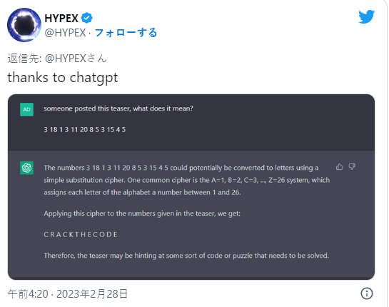 ·ChatGPT近期爆火,被誉为无所不能,那么破解密码是否可行呢?抱着这样想法的一位玩家似乎就着了《堡垒之夜》官方的“套”,2月28日今天戏《堡垒之夜》官方近日放出了一串数字神秘代码,3 18 1 3 11 20 8 5 3 15 4 5,迅速招来了喜欢ChatGPT的粉丝。