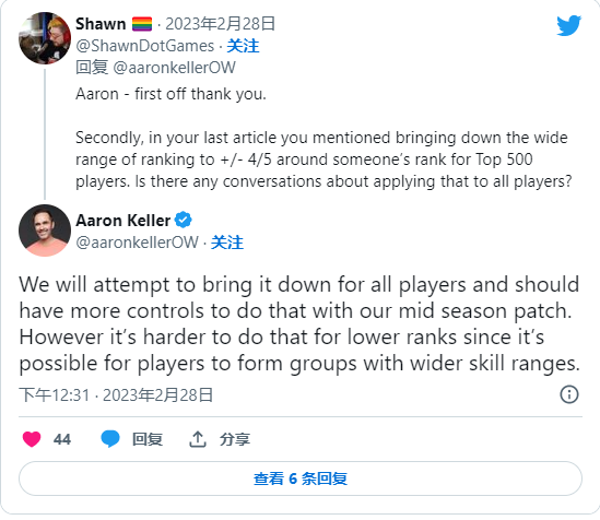 在回复中,当有玩家问到暴雪是否计划将所有玩家的匹配范围减少到四到五级以内,而不是像现在这样只限制前500 名时,Keller表示:“暴雪正在尝试这样做,并且将在发布《守望先锋2》的下一个赛季中期补丁时进行更多的改进。”