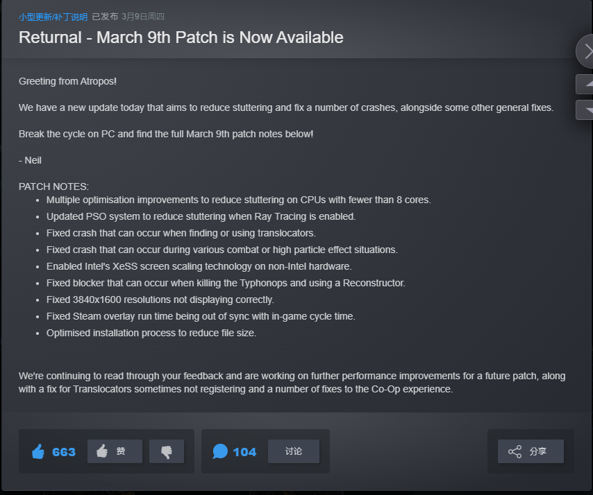 《死亡回归》PC版自发售以来就一直存在着卡顿和游戏崩溃的现象,近日游戏的开发商Climax Studios发布了一则新的更新,本次更新目的是为了减轻游戏的卡顿,优化游戏的稳定性,具体的信息一起来看看吧!