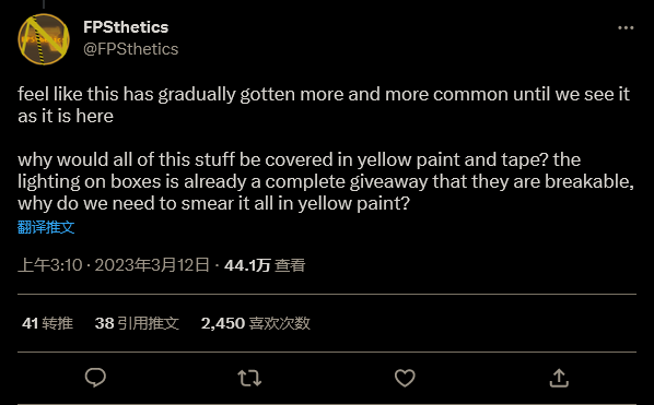FPSthetics 补充道:“感觉这种设计逐渐变得越来越普遍,直到我们以这种形式看到它。为什么所有的东西都要被黄色油漆和胶带覆盖?盒子上的光影效果已经可以看出它是可破坏物品了,为什么我们需要把它全涂上黄色油漆?”