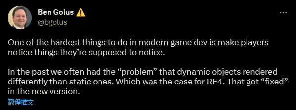 图形艺术家和程序员 Ben Golus 对这篇推文做出了回应,分析了将玩家的注意力吸引到物品和对象上由多么困难。他表示,在老游戏中因为可互动物品的渲染与环境物品略有不同,因此在原版《生化危机4》中玩家可以明显的区别两者。然而在重制版中,新技术情况已经不同,因此做出了这种修改。