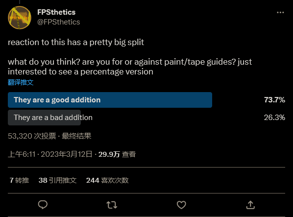 在推文发出后,许多玩家都表达了自己的想法,而 FPSthetics 也意识到也许并不是所有玩家都同意自己的观点。他随后发布了一个投票,提问人们是否支持这种设计。结果发现 73.7% 的人都认为这种设计挺好的。这也验证了 Ben Golus 的说法,他表示不希望有这种设计导致环境一致性被破坏的玩家是少数。