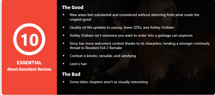 总评:无论你是原作粉丝还是渴望高质量的浓厚动作元素与恐怖氛围的游戏新手,《生化危机4》就像个被寄生虫缠身的西班牙人,无脑买就行了。它的战斗十分顺滑,但在其凶猛强大的敌人下亦不缺少压迫感。其叙事快速贯穿于不同结构的一系列动作场景中,但始终不变的是其一如既往的紧张感。它的世界细节丰富、充满了乐趣和令人兴奋的惊喜。它对原作的改进不胜枚举,从简单的质量提升到对Boss战机制的彻底改革,除了商人的个性的减弱之外有些令人失望外,Capcom团队几乎没有犯任何错误。想买了吗?有史以来最令人兴奋的生化危机冒险,经过重制、改进后的《生化危机4》充分发挥了其巨大潜力,这是个明智的选择,伙计。