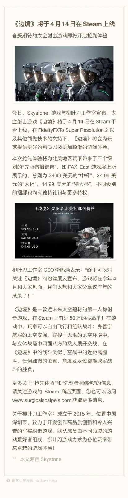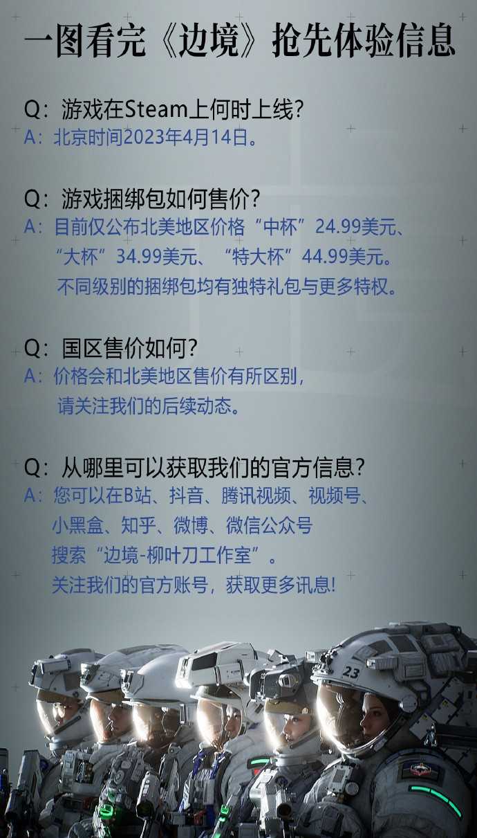 《边境》是一款太空题材的多人合作战术FPS射击游戏,该作由国产开发商柳叶刀工作室开发,游戏预计将会在4月13日上线Steam平台开启抢先体验,标准版售价24.99美元,豪华版24.99美元,终极版44.99美元。