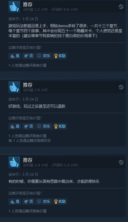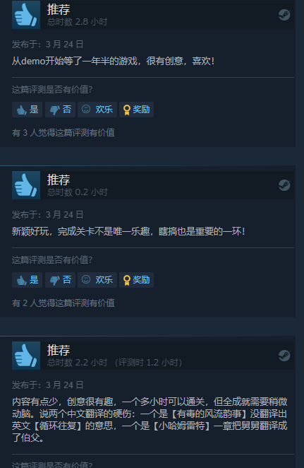 评价中玩家们集中表示游戏虽然流程较短,但创意新奇,值得一玩。