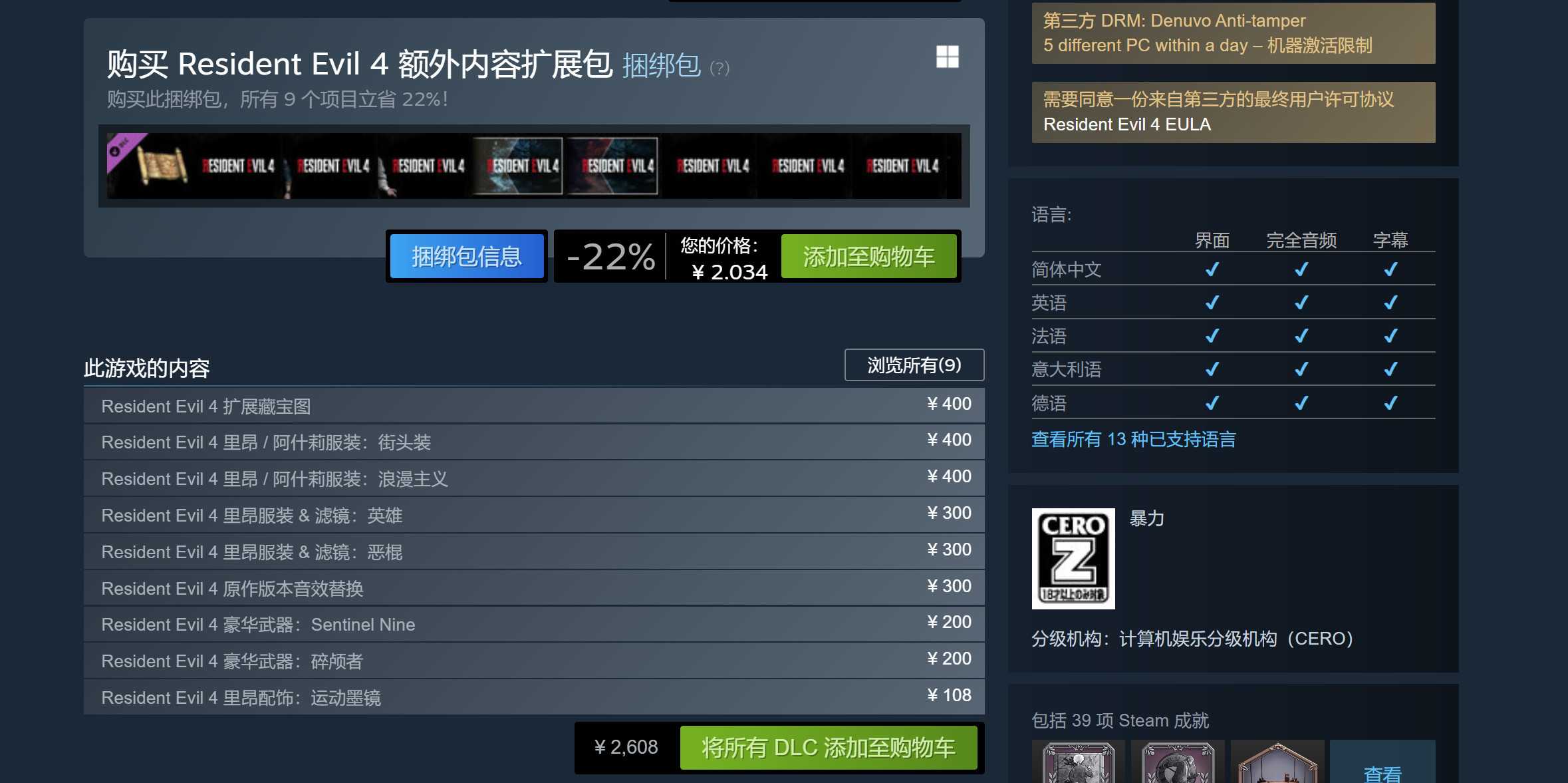 《生化危机4:重制版》Steam采用了D加密技术,一天之内限制五个不同的PC游玩。Steam支持简体中文和中文配音。