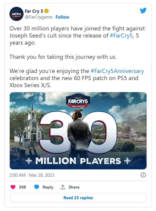 《孤岛惊魂5》作为育碧的经典作品,之前官方在Xbox Series X/S和PS5上推出了60FPS的补丁,让游戏的流畅表现更近一步,目前游戏的玩家数量已经超过了3000万,对于游戏来说这也算是一个成功的证明了。