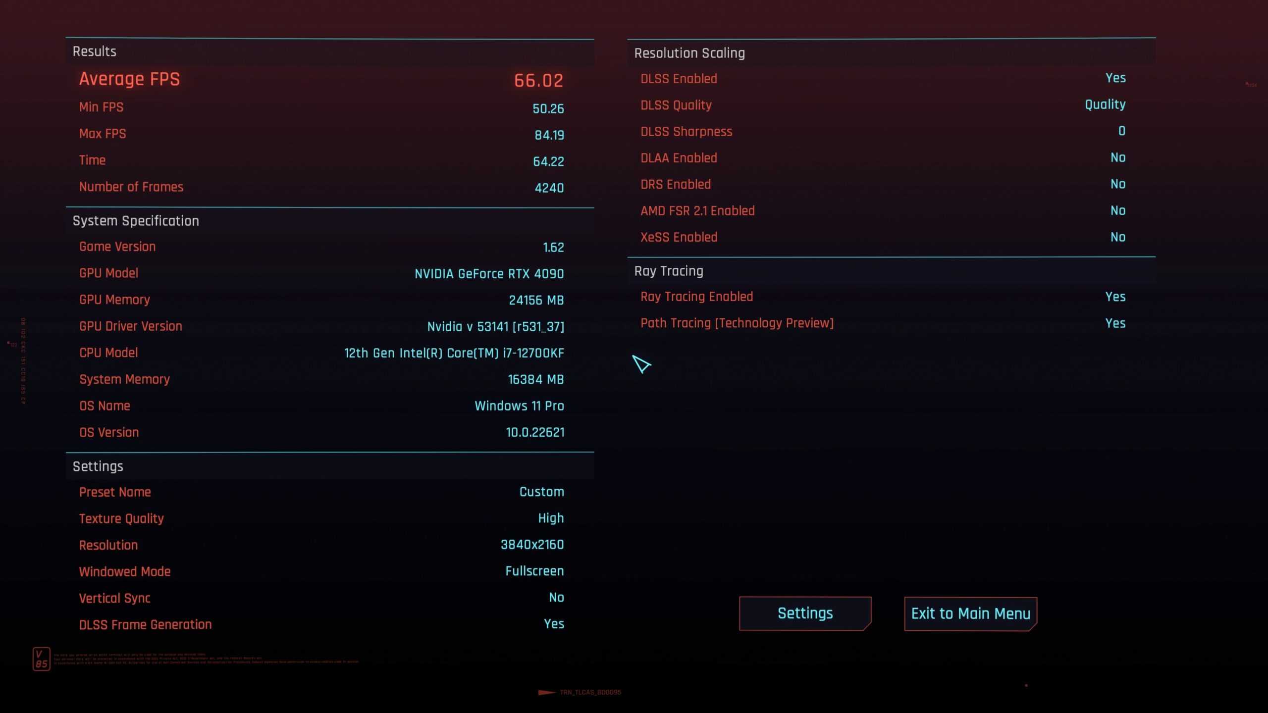 当然RTX 4090在二者都开启的情况下表现最好。在激活DLSS3(帧生成)后,将超分辨率调至质量模式(1440P拉伸),平均FPS:66.02